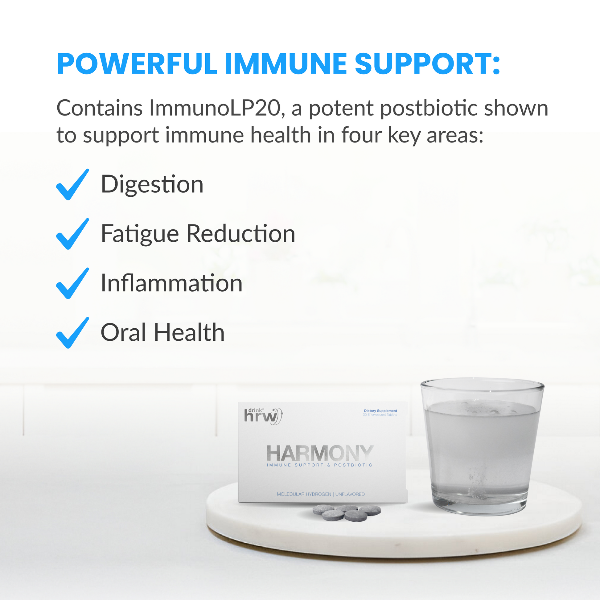 HARMONY is a blend of our proprietary hydrogen tablet formula and ImmunoLP20® postbiotic technology for comprehensive immune support and cellular protection.